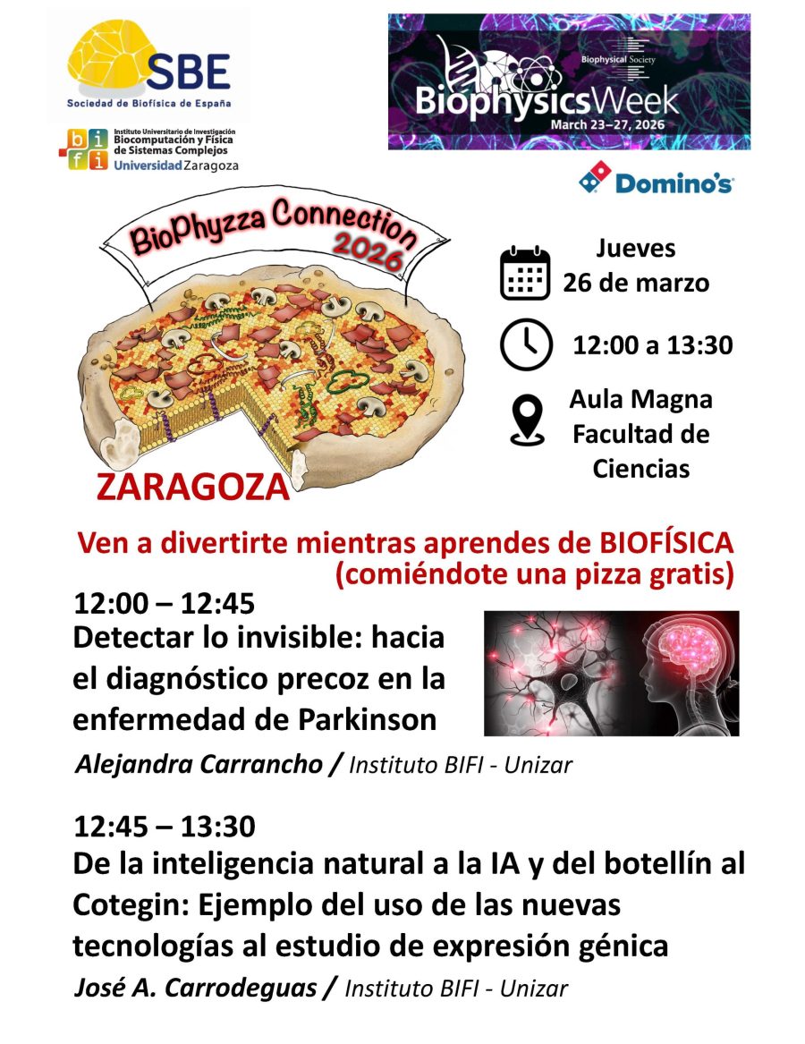 La ciencia y la divulgación se dieron cita en la Universidad de Zaragoza con un evento que combinó el conocimiento con un ambiente distendido: BioPhyzza Connection 2026. En el marco de la Biophysics Week, la Sociedad de Biofísica de España organiza la 𝐵𝑖𝑜𝑃ℎ𝑦𝑧𝑧𝑎 𝐶𝑜𝑛𝑛𝑒𝑐𝑡𝑖𝑜𝑛, una iniciativa que acerca la biofísica al público general en un entorno informal, acompañado de una porción de pizza.
