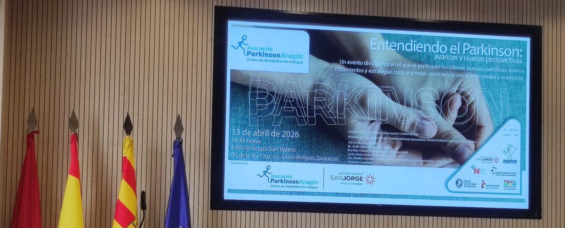 On Monday 13 April, BIFI researcher Nunilo Cremades participated in a Parkinson’s disease conference entitled ‘Understanding Parkinson’s: Advances and New Perspectives”, organised by the Aragón Parkinson’s Association and San Jorge University. The date was chosen to coincide with World Parkinson’s Day on 11 April.
